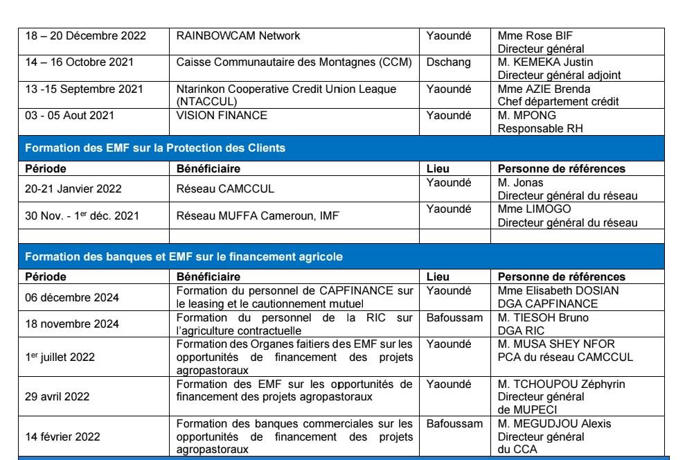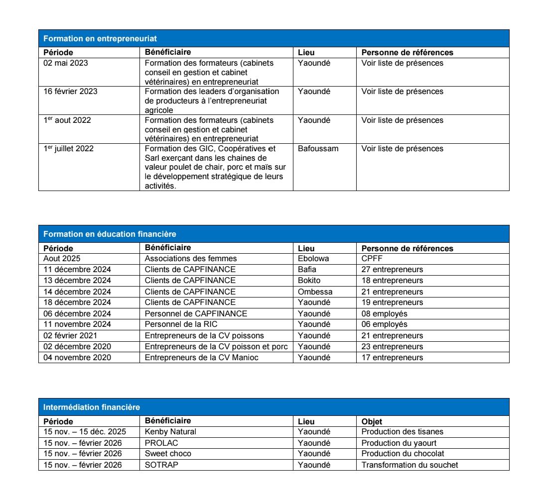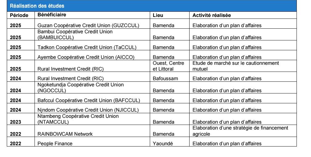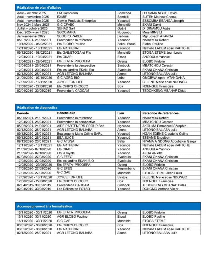 ABC Consulting s’appuie sur une expertise éprouvée dans l’accompagnement des entrepreneurs et des institutions financières. Nos références témoignent de notre capacité à intervenir efficacement sur toute la chaîne de valeur : structuration, formation, financement et conseil stratégique.